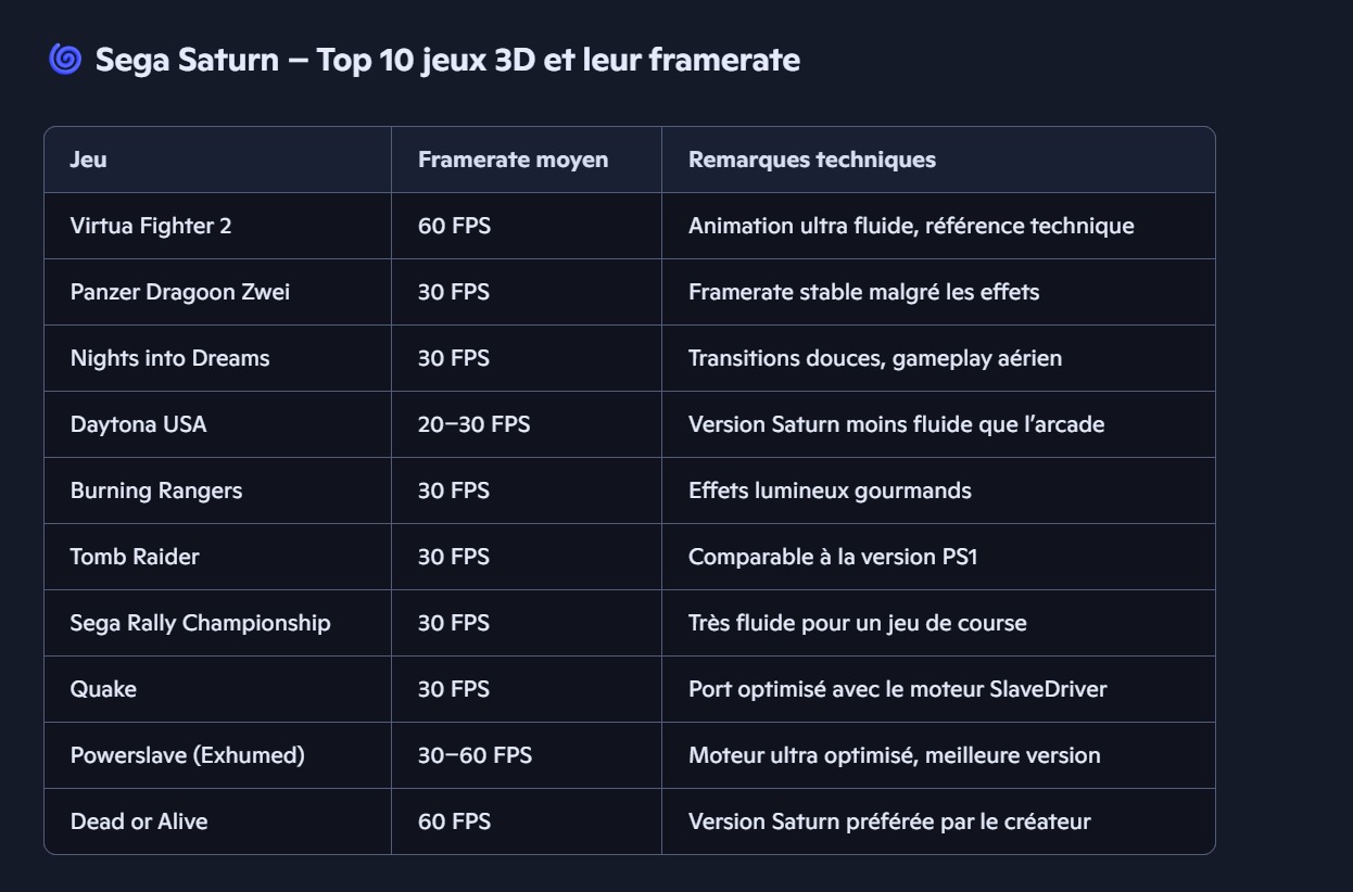 Je me suis amusé à demander à l'IA de me faire un top des jeux 3D et leur frame rate à l'époque des premières consoles grand public 3D