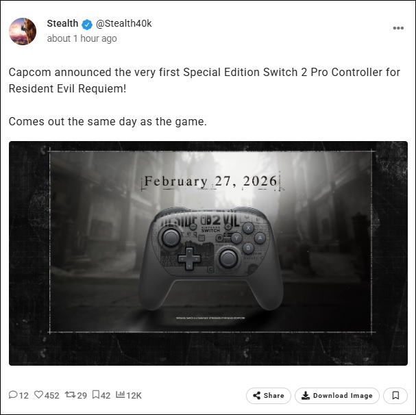 Une manette Switch 2 Pro aux couleurs de Resident Evil Requiem sera lancée le même jour que le jeu, le 27 février 2026.