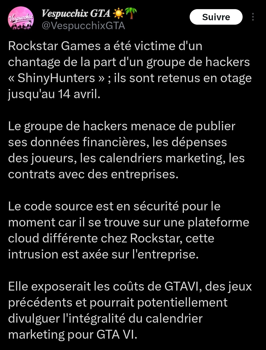 Rockstar Games a été victime d'un chantage de la part d'un groupe de hackers « ShinyHunters » ; ils sont retenus en otage jusqu'au 14 avril.