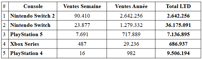 A noter qu'il y a que 4 jeux PS5 dans le top 30, tout le reste c'est Switch (17 jeux) et Switch 2 (9 jeux)