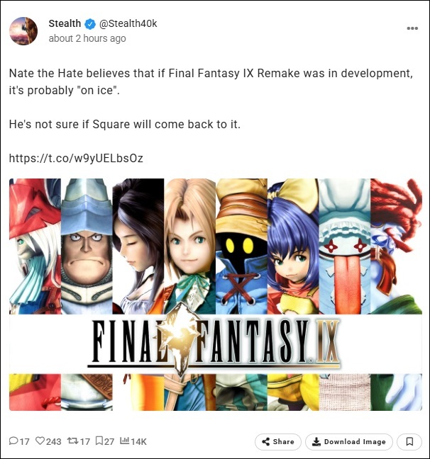 Nate the Hate estime que si Final Fantasy IX Remake était en développement, il est probablement en suspens.