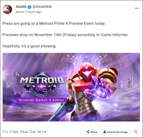 Des journalistes se rendent aujourd'hui à une avant-première de Metroid Prime 4. Les avant-premières seront disponibles le 14 novembre (vendredi), d'après Game Informer.