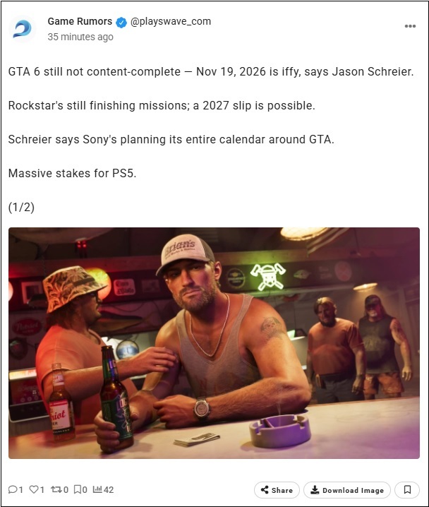 Bien que Schreier n'ait pas précisé la date à laquelle il avait eu des nouvelles de GTA 6 concernant un contenu incomplet, il a indiqué que le jeu était toujours en développement, les équipes travaillant encore sur ses différents aspects. Cela inclut les niveaux, les missions et la finition générale. Malgré cela, il a estimé que la date de sortie actuellement prévue pour novembre 2026 lui semblait « plus réaliste » que la fenêtre de lancement de l'automne 2025 annoncée l'année dernière.