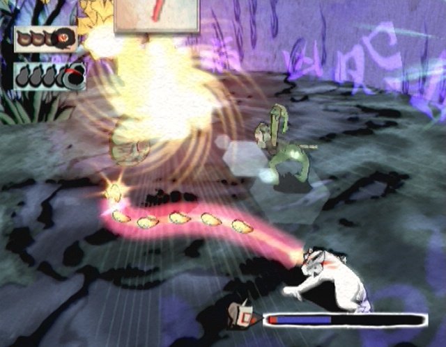 Les combats sont un déchainement de magnifiques effets (un peu trop parfois, mais c'est tellement beau) et ont un peu petit côté Devil May Cry, quand on fait jaillir l'ennemi dans les airs avec un léger ralenti pour le trancher en deux d'un coup de... pinceau !