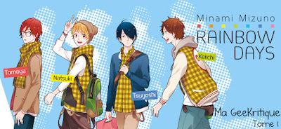 Ce premier tome met clairement en avant Natsuki. Je ne vais pas y aller par quatre chemins, ce n’est pas mon personnage favori. Il ne sort pas du lot pour moi, il est beaucoup trop naïf, trop efféminé à mon goût même. Mais bon les goûts et les couleurs de chacun… Bref. Je reproche un peu à Minami Mizuno de s’être trop attarder sur ce dernier, laissant au second plan ses trois autres camarades et là j’annonce la couleur d’emblée, j’adore Keiichi ! Je trouve qu’il en impose bien plus que les autres, tout comme Tomoya, mais un déca en dessous. La façon d’agir de Tomoya et son comportement envers les filles m’ont bien fait délirer. Mais les répliques de Keiichi sont excellentes, il casse le stéréotype que l’on peut se faire des relations amoureuses. Son langage cru est très apprécié de mon point de vue, et puis on est entre mecs, non ?