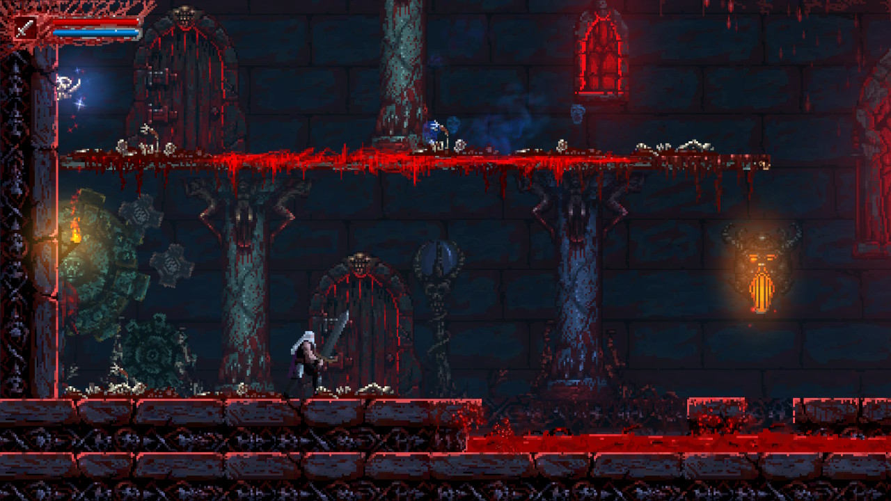 S’il y a bien deux points qui font la différence concernant Slain: Back from Hell, c’est concernant sa direction artistique et sa bande son. Il bénéficie d’une réalisation en Pixel Art de haute volée. Tout est animé et les arrière-plans sont souvent magnifiques et très fournis. C’est gore, violent, gothique et une fois en mouvement, c’est de toute beauté ! La bande son du jeu n’est pas en reste, si tant est qu’on adhère à la musique métal. Ça envoie de la guitare, de la basse et de la batterie à tout va et ça colle parfaitement au style du jeu. L’immersion est ici parfaite !
