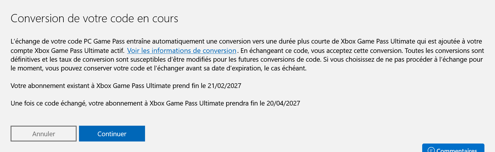 en fait je n'avais pas remarqué mais la conversion du Gamepass PC vers le Gamepass ultimate est resté avantageuse notamment lorsqu'on est DEJA ABONNE au gamepass ultimate!