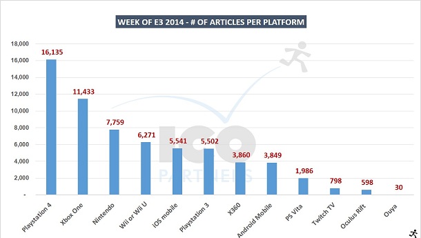 Si l'on s'appuie sur ledit graphique, la PS4 et Sony en général (avec la PS3 et la PS Vita) a nettement dominé la période de l'E3 au niveau de la couverture médiatique, suivie non loin par les marques Microsoft (Xbox One + Xbox 360), puis l'univers Nintendo.