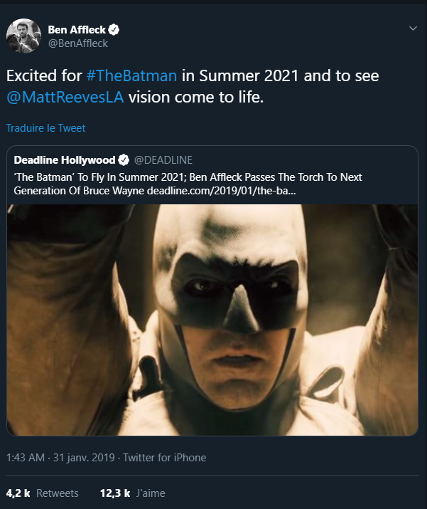 ET Ben Affleck ne serra visiblement plus l’interprète du chevalier, tres déçu mais assez attendu pour beaucoup...