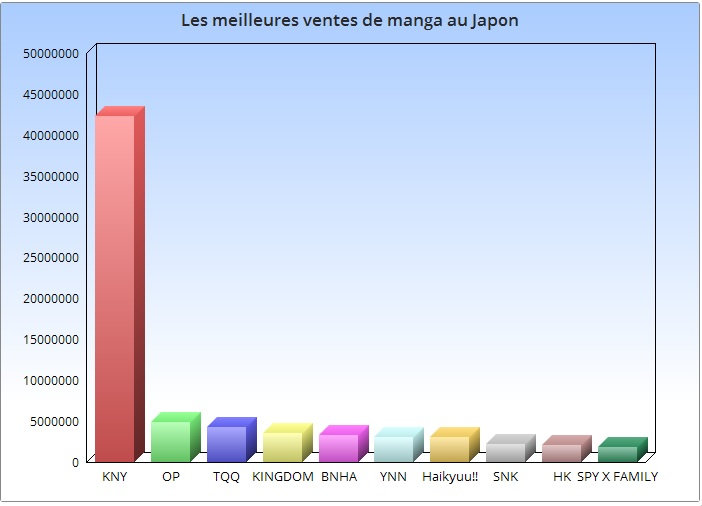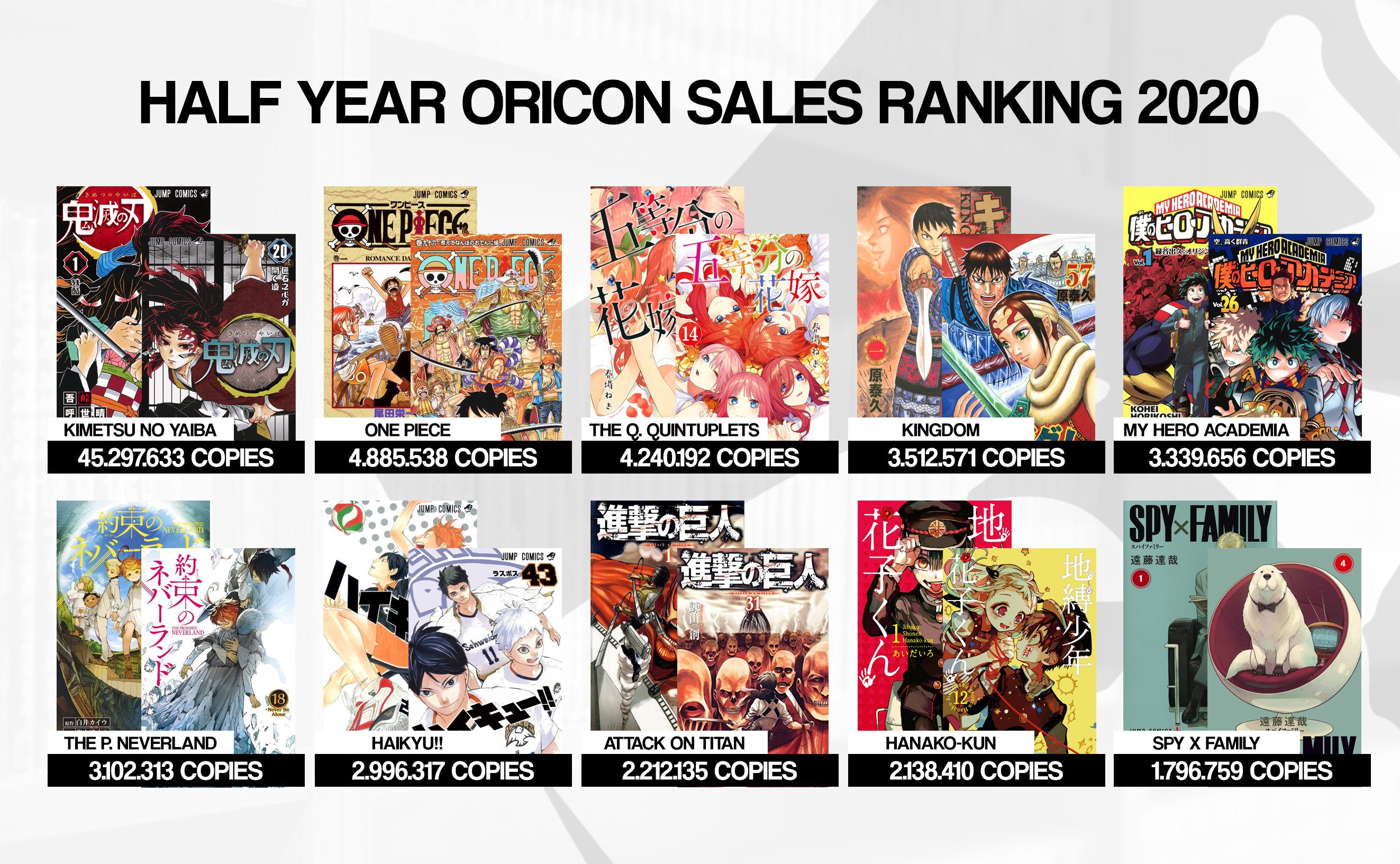 du 18 novembre 2019 au 17 mai 2020 la première a la dix-neuvièmement place est prise par Kimetsu no Yaiba.(et même la vingtième place si le tome 20 n’était pas divisé par édition).
