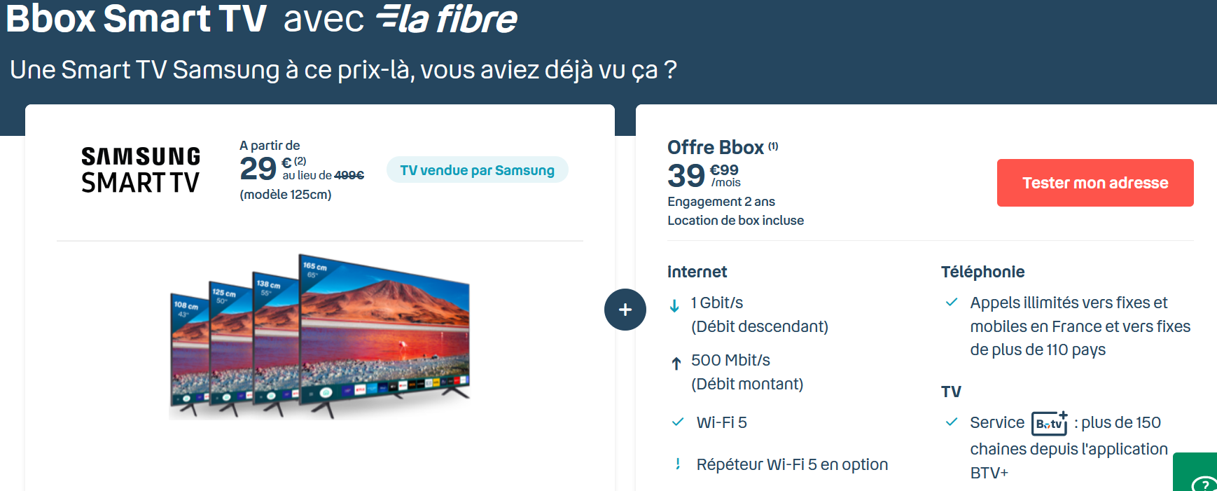 bon j'ai deja souscris a l'offre bbox smart tv ya un peu plus d'une semaine la j'attend le technicien demain ,mais la c'est du delire ,attention tout de meme je l'ai vu qu'un jour en stock sur le site la 50" samsung depuis 1 semaine ,seul les 55" et au dessus sont presente de facon permanente.
