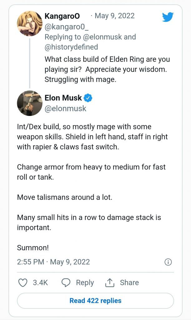 Entre deux réunions au conseil d'administration de Twitter, Elon a assez de temps pour jouer à Elden Ring.