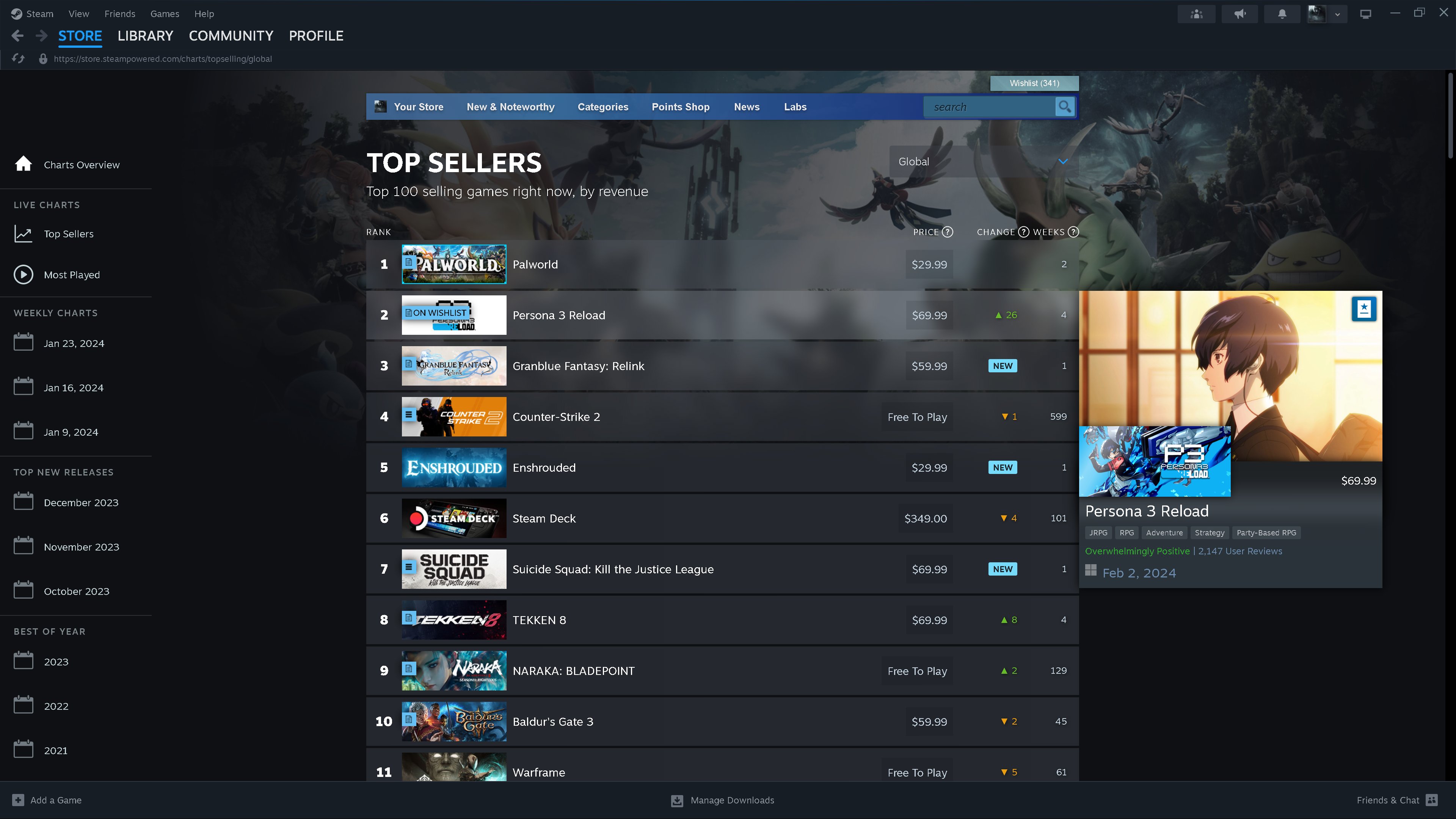 Avec un record de pic de joueurs a plus de 85 000 en profil public aujourd'hui, il fait bien mieux que Persona 3 et Like a Dragon IW, certes dispo dans le Gamepass.