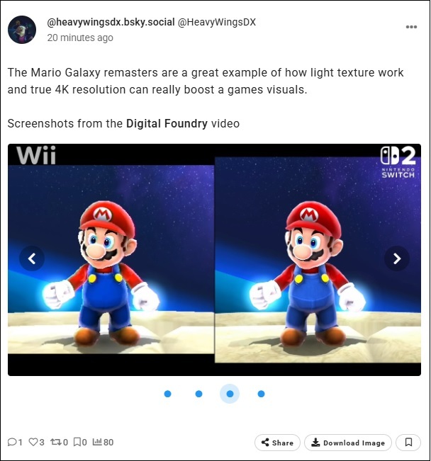 Je ne vois aucun miracle. C'est un remaster banal avec un travail sur la résolution. Et qui se permet le luxe d'être vendu 10€ plus cher que les autres jeux Mario sur Switch.