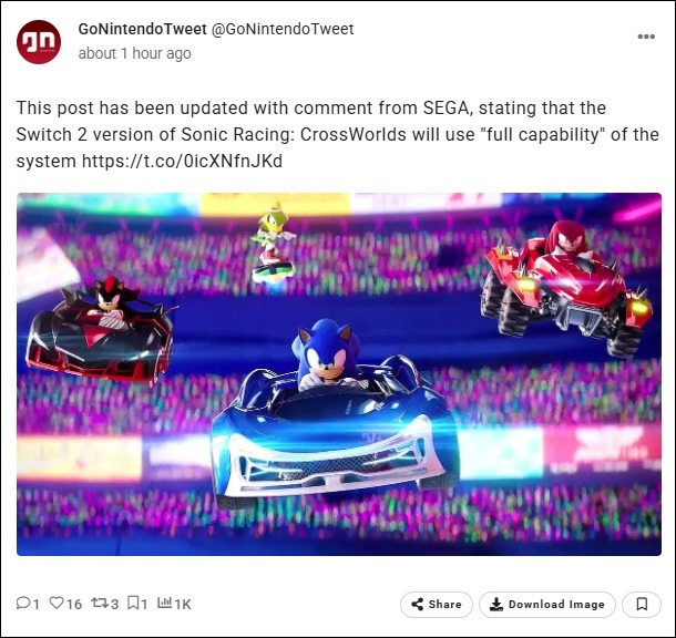 De plus, la Nintendo Switch 2 n'a pas profité du récent lancement de Sonic Racing: CrossWorlds, mais Takashi Iizuka, producteur de la série Sonic, affirme que le jeu exploitera pleinement les capacités de la console. Techniquement, vous pouvez jouer au jeu sur la dernière console de Nintendo grâce à la rétrocompatibilité avec la Switch 1. Cependant, la version Nintendo Switch 2 devrait présenter des avantages.