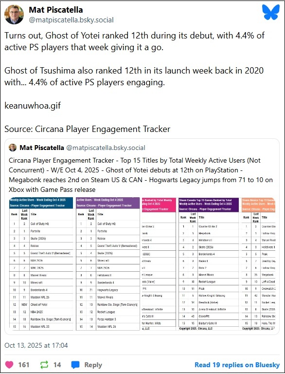 De plus, Il s'avère que Ghost of Yotei s'est classé 12e lors de son lancement, avec 4,4 % des joueurs PS actifs la semaine dernière qui l'ont essayé. A titre de comparaison, Ghost of Tsushima s'est également classé 12e lors de sa semaine de lancement en 2020, avec 4,4 % des joueurs PS actifs qui l'ont essayé.