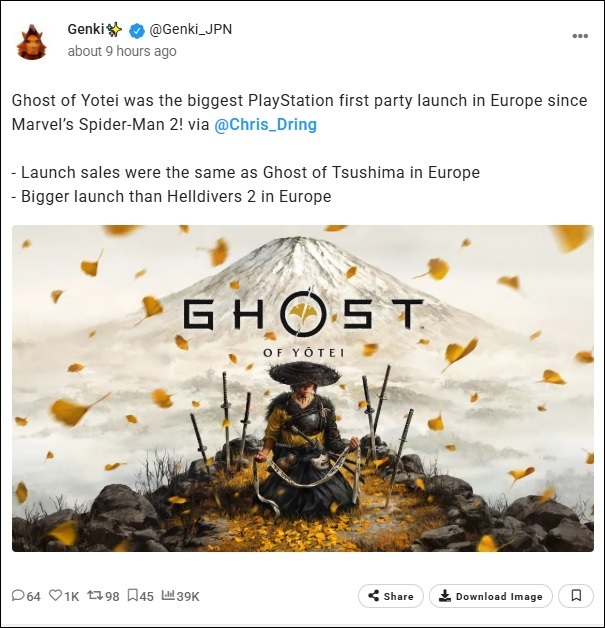 - Les ventes de lancement ont été similaires à celles de Ghost of Tsushima en Europe