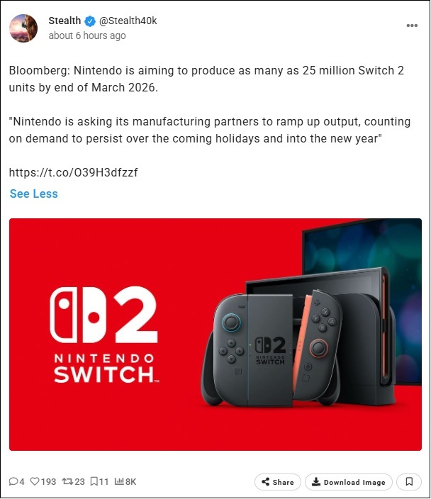 Nintendo Co. a demandé à ses fournisseurs de produire jusqu'à 25 millions d'unités de la Switch 2 d'ici fin mars 2026, préparant ainsi l'entreprise à des ventes record pour la première année d'une console qui a déjà atteint des sommets dans le secteur mondial du jeu vidéo.