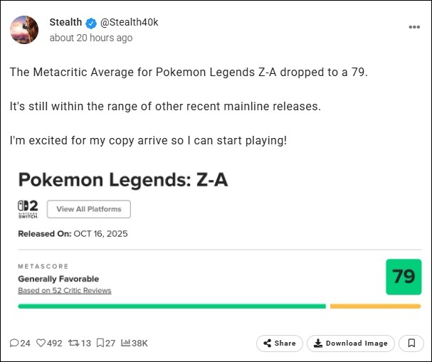 Avant le titre tournait à 81/100. Cependant , sa moyenne Metacritic pour Légendes Pokémon Z-A est tombée à 79/100. Elle reste quand même dans la fourchette des autres jeux majeurs récents.
