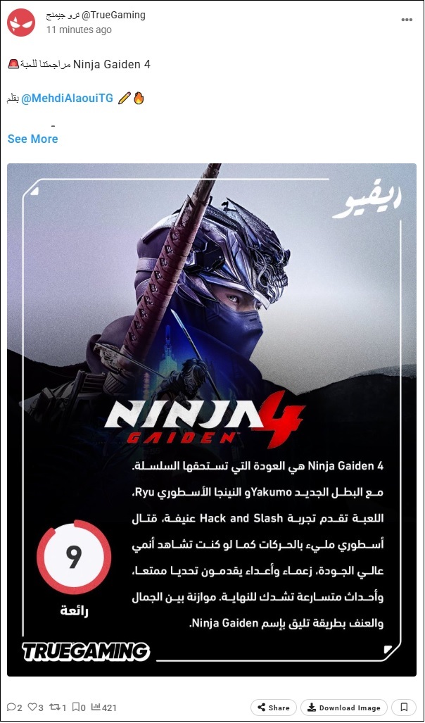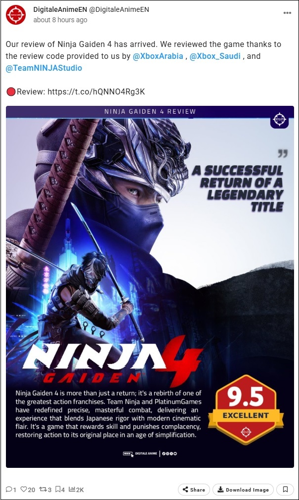 Deux notes sont tombées pour le jeu Ninja Gaiden 4 :