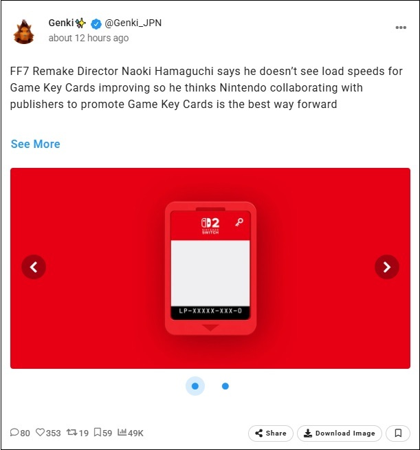 Naoki Hamaguchi, directeur de FF7 Remake, affirme ne pas voir la vitesse de chargement des cartouches normales s'améliorer par rapport aux Game Key Card. Il pense donc que la collaboration entre Nintendo et les éditeurs pour promouvoir ces cartes est la meilleure solution.