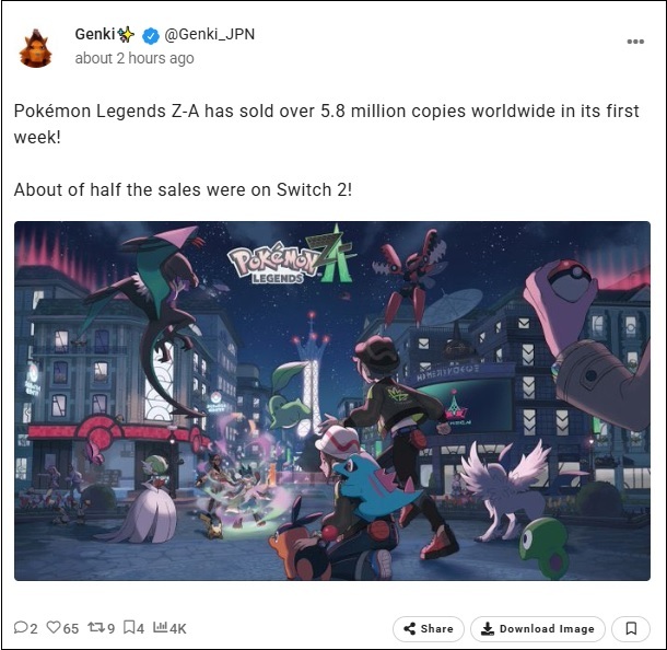 Les ventes totales de Pokemon Legends : Z-A ont dépassé les 5,8 millions d'unités dès sa première semaine de sortie, a annoncé The Pokémon Company. Près de la moitié de ces unités vendues ont été achetées sur Nintendo Switch 2.