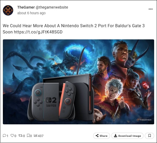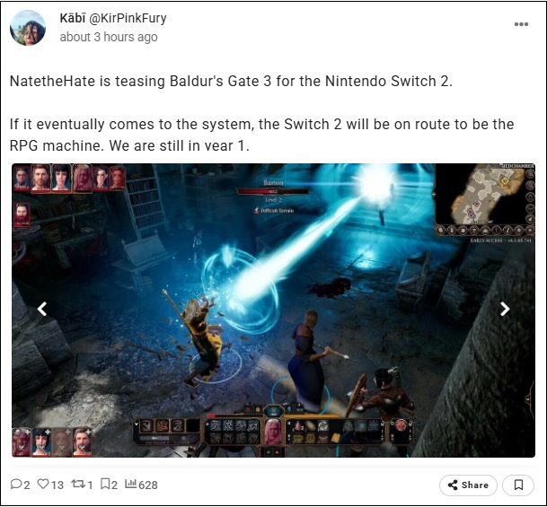 En réponse à un fan sur Twitter qui l'interrogeait sur la possibilité d'une sortie de Baldur’s Gate 3 sur la dernière console de Nintendo, l'informateur a répondu : « Nous vous tiendrons au courant prochainement. » Sans être totalement concluant, l'informateur dénonce généralement sans détour les spéculations sur des portages dont il n'a pas entendu parler.