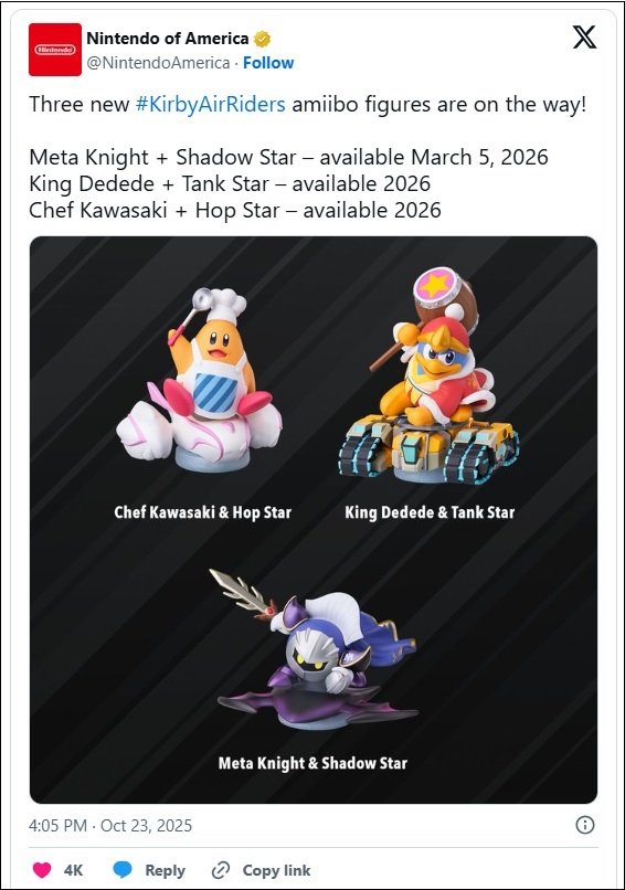 En plus des figurines amiibo Kirby et Bandanna Waddle Dee annoncées précédemment, trois autres figurines sortiront plus tard en 2026. Elles représenteront Meta Knight (avec une Étoile d'Ombre), le Roi Dadidou (avec une Étoile Tank) et le Chef Kawasaki (avec une Étoile Hop).