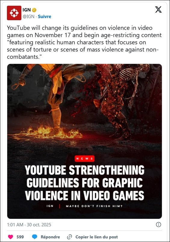 YouTube met à jour son règlement afin de restreindre l'accès aux contenus comportant des scènes de jeux vidéo à forte violence, a annoncé la plateforme mardi. À compter du 17 novembre, les comptes des moins de 18 ans et les utilisateurs déconnectés ne pourront plus visionner de vidéos de jeux mettant en scène des personnages réalistes impliqués dans des scènes de violence de masse contre des civils ou de torture. Le jeu en ligne sera également concerné, même sans argent réel.