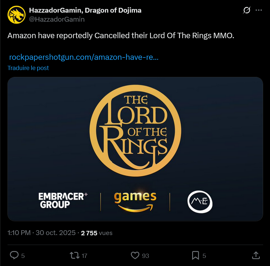 Amazon a annulé sa deuxième tentative de création d'un MMO Lord Of The Rings dans le cadre de récents licenciements massifs, selon un ancien ingénieur senior en gameplay chez Amazon Games.