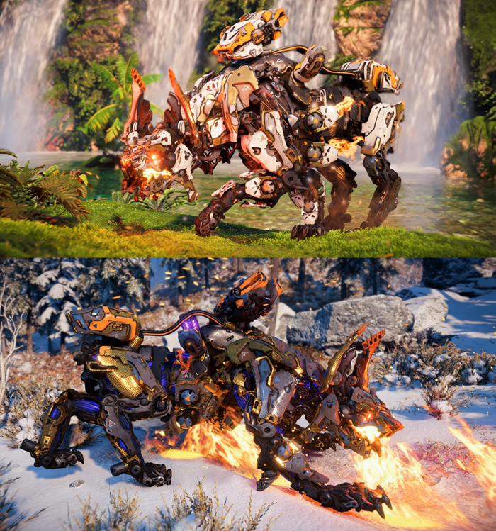 L'apparence des machines du jeu n'est pas fixe. Au fur et à mesure qu'Aloy les traque et les élimine, Héphaïstos s'adapte en renforçant leur blindage. Le nombre de machines à éliminer varie selon le modèle (une quinzaine pour les plus petites, tandis qu'une seule suffit pour les plus dangereuses tel que le fameux Gueule d'orage). Une fois cette évolution effectuée, le joueur ne rencontrera plus que la version la plus blindée. On peut le remarquer notamment sur les bonbonnes (acide, feu, gel, électrique,...) qui gagnent une capsule de protection.
