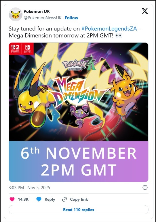 Moins de trois semaines après la sortie de Pokémon Legends : Z-A, The Pokémon Company nous réserve des nouvelles demain concernant le prochain DLC, Méga Dimension. Demain, nous aurons droit à une mise à jour sur le DLC, qui inclura deux versions de Méga-Raichu et le Pokémon fabuleux Hoopa.