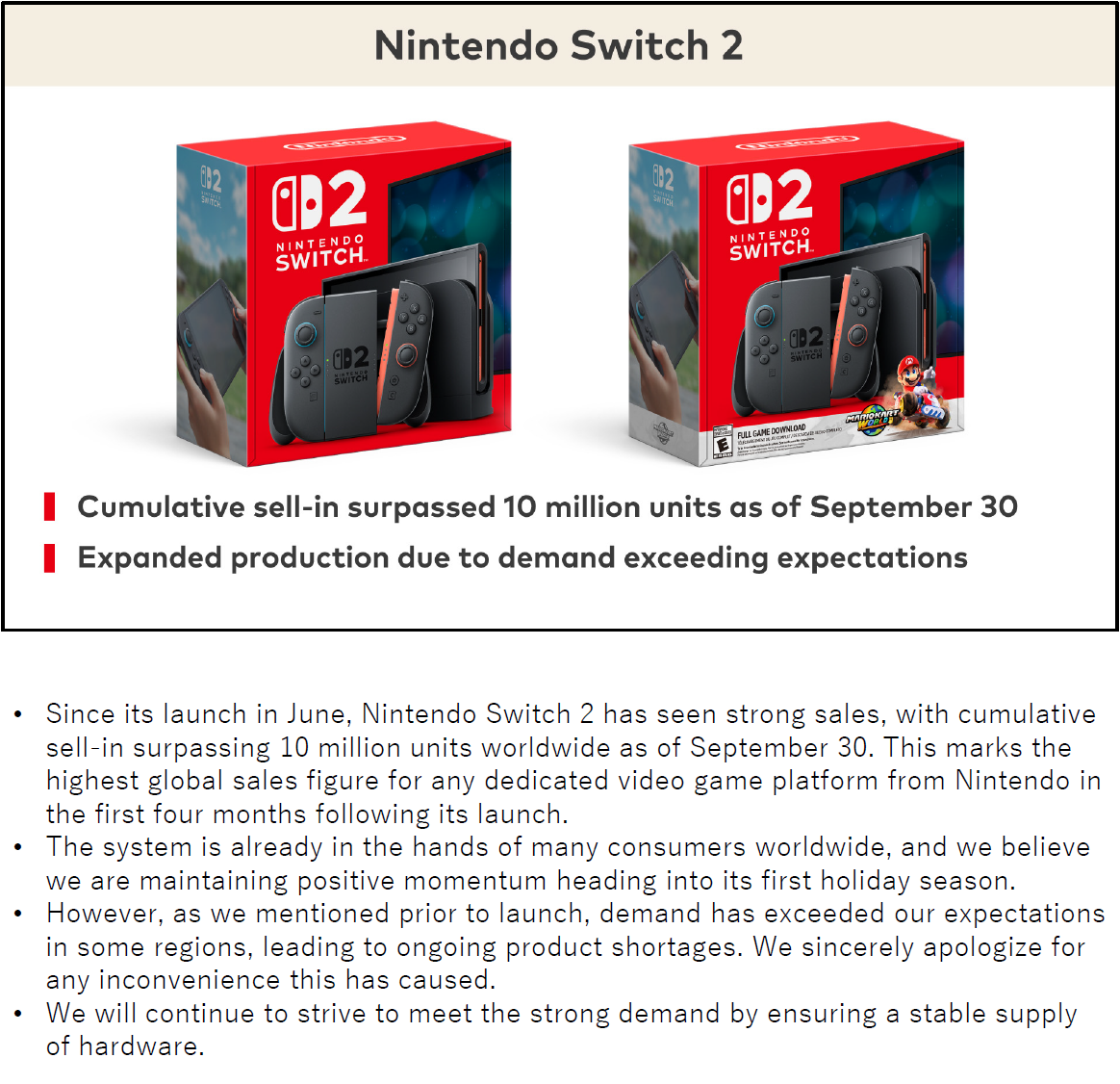 la Switch 2 s’est écoulée à 10 millions d’exemplaires depuis son lancement et jusqu’au 30 septembre. Mais aussi qu’ils s’attendent en toute logique d’une augmentation des ventes à l’approche des fêtes de fins d’année.