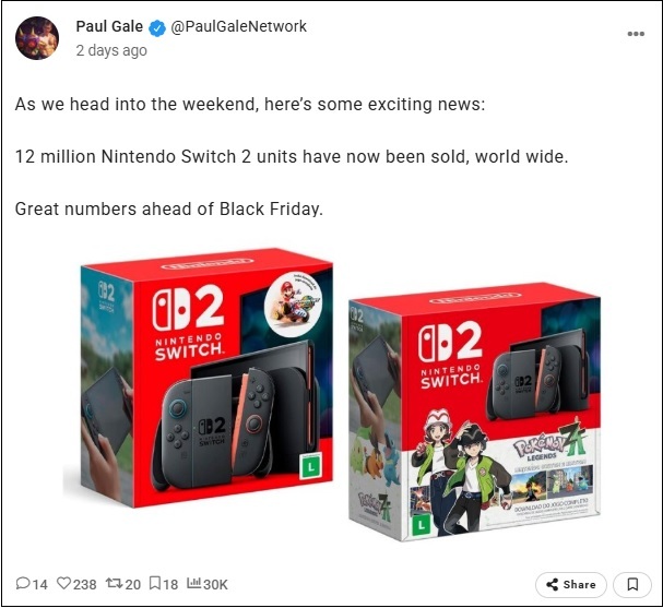 Selon PaulGaleNetwork, voici une excellente nouvelle : 12 millions de consoles Nintendo Switch 2 ont été vendues dans le monde entier. Des chiffres exceptionnels avant le Black Friday.
