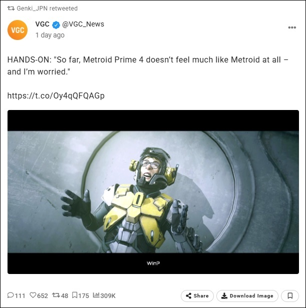 "On dit que les premières impressions sont trompeuses, et en tant que fan de Metroid Prime attendant avec impatience le premier opus depuis 18 ans, j'espère vraiment que ce que j'ai joué jusqu'à présent n'est pas représentatif du jeu final. Car pour moi, ça ne ressemble pas vraiment à Metroid.
