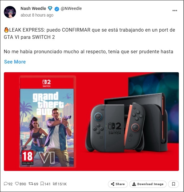 Nash Weedle, qui avait leaké avec précision Metroid: Samus Returns et Metroid Dread avant tout le monde, affirme qu'un portage de GTA VI pour Switch 2 est en préparation. Il ajoute :