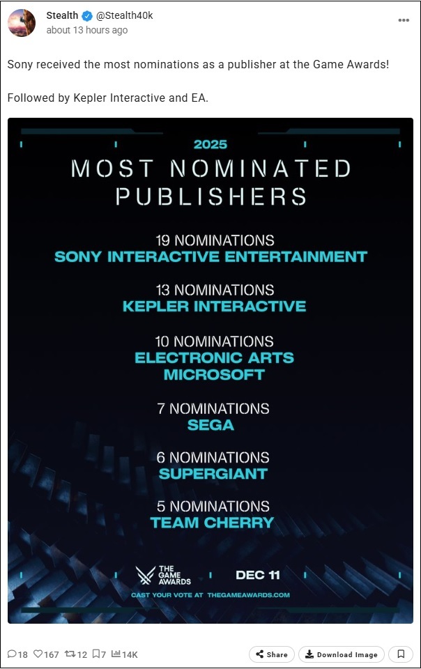 Et que dire de Sony qui prend 19 nominations, dont 8 pour DS2 et GoY chacun alors que c'était clairement pas une grande année pour les AAA, mais plutôt pour les indés.