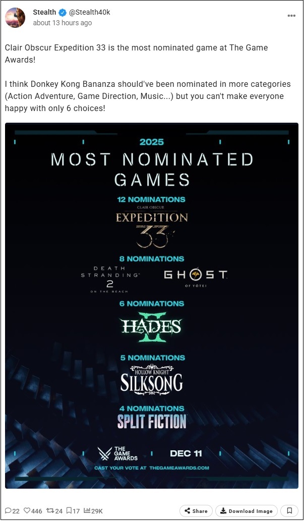 Les Game Awards ont officiellement annoncé les nominations pour l'édition de cette année, qui se tiendra le 11 décembre 2025. La catégorie « Jeu de l'année » est assez prévisible, tout compte fait, mais c'est tout de même agréable de voir Donkey Kong Bananza récompensé. Cela dit, la concurrence est rude cette année, et nous pensons que Clair Obscur: Expedition 33, qui a décroché un nombre record de 12 nominations, remportera probablement le prix.