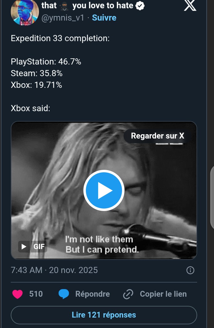 jenicris yep, et puis le gamepass, ça "fausse" tellement le chiffre Xbox s'il est de seulement 20%, parce qu'on consomme pas de la meme façon un produit qu'on achete ou qu'on accede a travers un service.