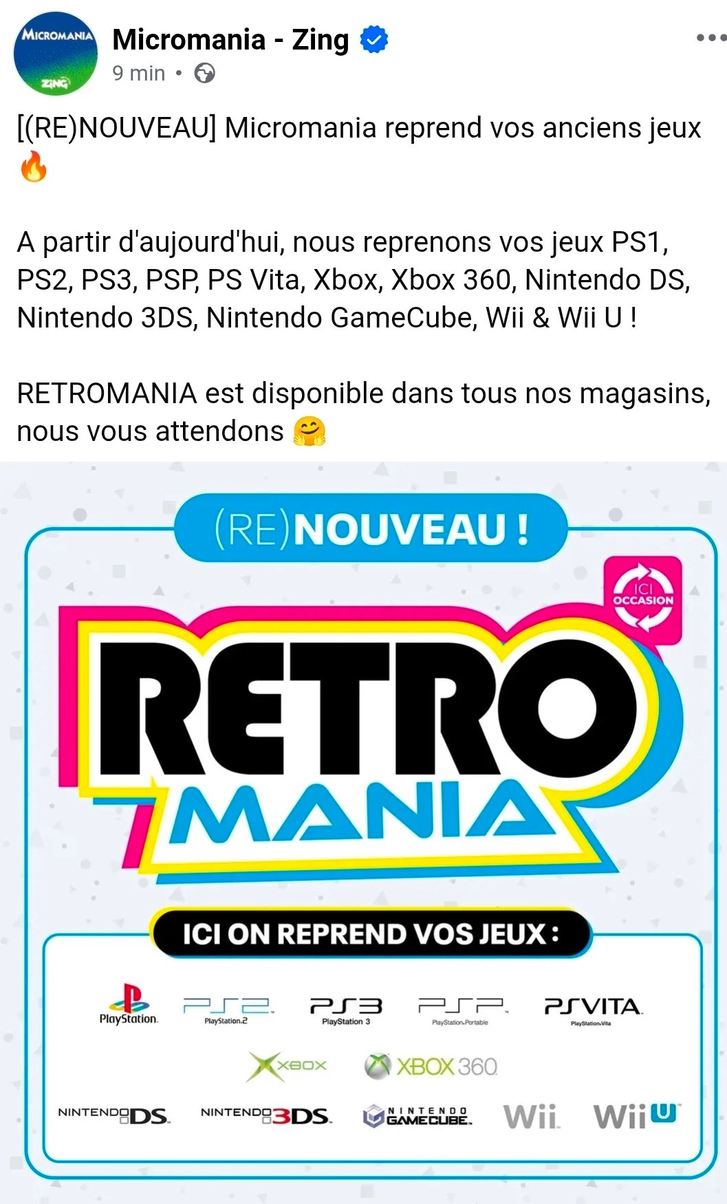forte Sache qu'en interne et d'après quelques sources, Micromania aurait déjà eu l'intention de faire du Retrogaming, vers 2015-2016 (peu avant la fusion avec Zing), ils avaient même refait pour l'occasion quelques stickers alarme pour les magasins servant d'antivol, où l'on voyait "Revendez vos jeux Xbox, PS et Nintendo", avec les vieux logos des constructeurs, laissant supposer que c'était sur le tapis.