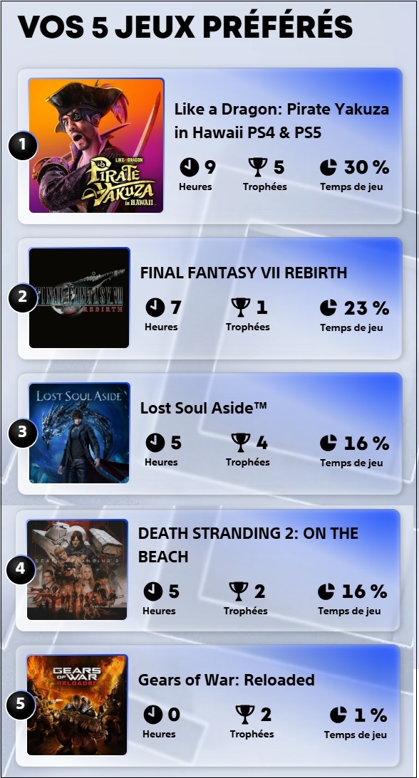 torotoro59 Les 2 ont des erreurs je pense. Je vais allé véréfié mais je suis sûr que j'ai joué plus de 0 heure à Ghost of Yotei et Gears of War Reloaded. je vais aller vérifier sur ma Ps5, si on peut.