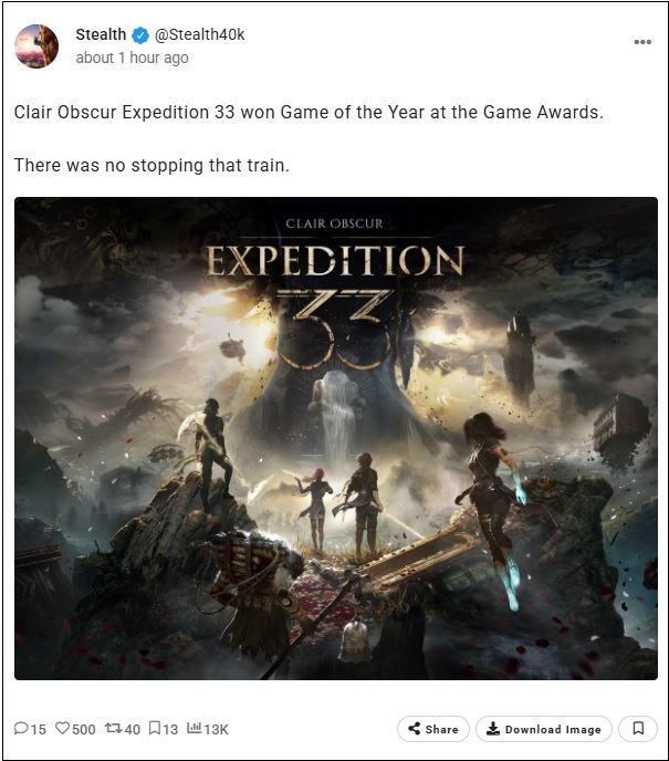 Clair Obscur : Expedition 33 a remporté le prix du Jeu de l'année aux Game Awards 2025. Le RPG acclamé par la critique du studio français Sandfall Interactive a raflé la plus prestigieuse récompense de la soirée, ainsi que les prix du Meilleur jeu indépendant, du Meilleur premier jeu indépendant, de la Meilleure direction artistique, de la Meilleure musique, du Meilleur RPG, du Meilleur scénario, de la Meilleure réalisation et de la Meilleure performance (pour Jennifer English).