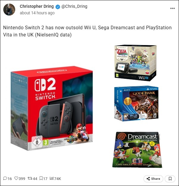 Source : [urlhttps://www.gonintendo.com/contents/56342-switch-2-outsells-wii-u-vita-and-dreamcast-in-uk-outpacing-switch-s-first-year-sales/[/url]