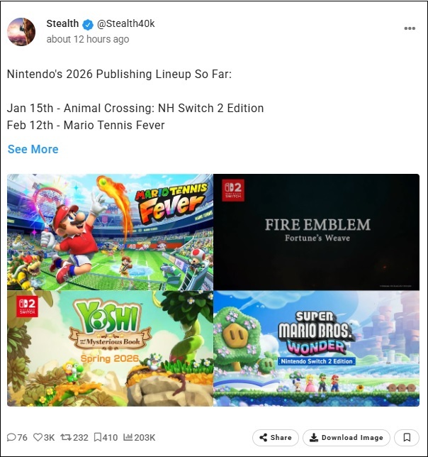Pour le moment, le planning Nintendo pour 2026 est assez maigre :