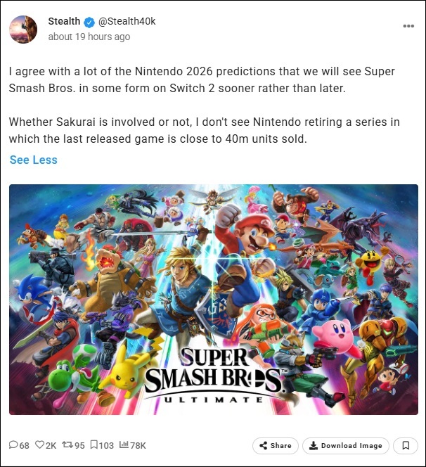 Par conséquent, Nintendo a tout intérêt à proposer un Super Smash Bros. sur Switch 2. Ils pourraient même être disposés à allouer à Sakurai un budget encore plus important que la dernière fois, compte tenu du succès retentissant du précédent opus.
