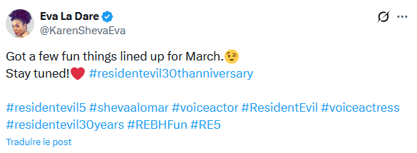 #ResidentEvil5, ainsi qu’une vidéo dans laquelle elle déclare :