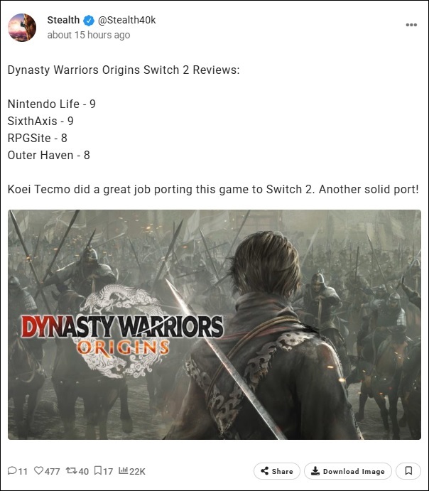 KOEI TECMO America et le studio Omega Force ont annoncé la sortie de leur jeu d'action tactique, DYNASTY WARRIORS: ORIGINS, le 22 janvier 2026 sur Switch 2. Vous vous demandez comment le jeu se comporte techniquement sur Switch 2 ? Regardez la vidéo ci-dessus pour découvrir une comparaison détaillée avec la version PS5, notamment au niveau des graphismes et de la fluidité :