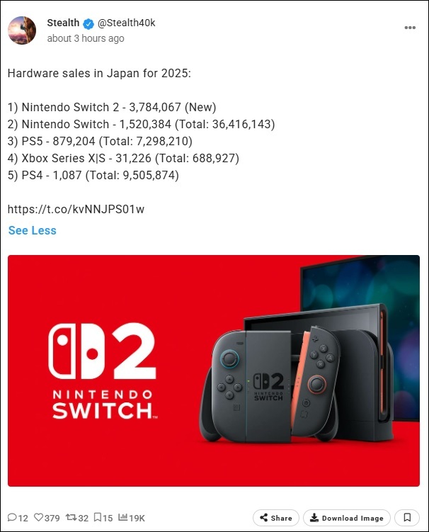 Bien que Nintendo ait connu un léger ralentissement des ventes de la Switch 2 pendant les fêtes de fin d'année, la société a conservé sa position de leader sur le marché japonais. Selon les nouvelles données de ventes annuelles de Famitsu (reçues par VideoGamesChronicle), 3,78 millions d'unités de la console ont été vendues depuis son lancement. Ces chiffres en font la console la plus rapidement vendue au Japon à ce jour.