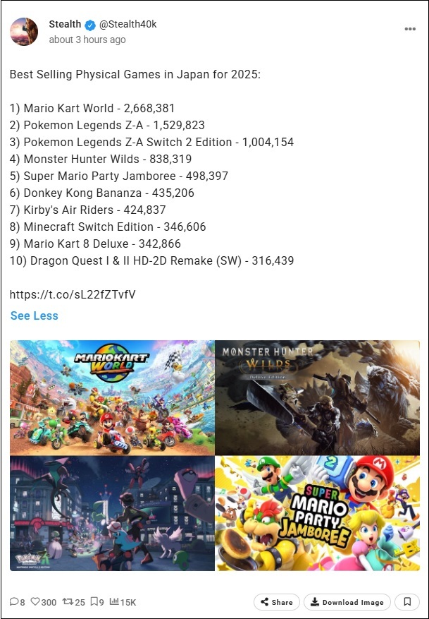 Concernant les ventes de jeux vidéo, Nintendo a également dominé les classements, poursuivant ainsi sa domination ininterrompue sur le marché des jeux physiques, une situation qui dure depuis 21 ans. Le rapport indique que les jeux Switch et Switch 2 occupent 9 des 10 premières places des ventes de jeux physiques. Parmi ces titres figure Mario Kart World, jeu de lancement de la Switch 2, qui s'est écoulé à 2,66 millions d'exemplaires au Japon. Retrouvez le classement complet des 10 meilleures ventes ci-dessous.