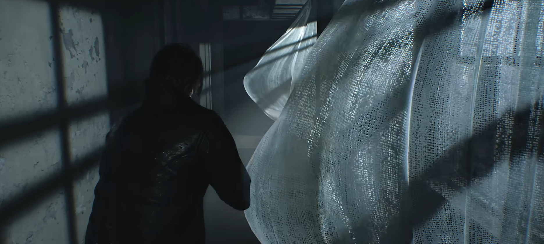 Leon progressant dans des couloirs lugubres, bordés de longs rideaux en mouvement, une mise en scène directement évocatrice de